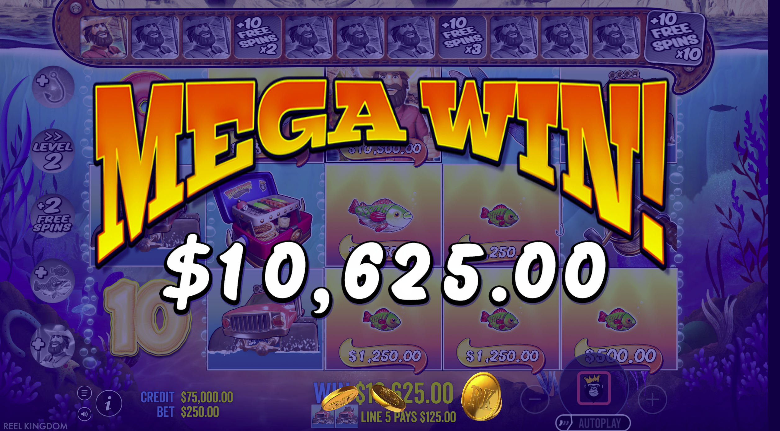 During free spins, fish-money symbols and fisherman wilds become key: wilds collect the values of fish symbols on screen, which then converts them into payouts. Added to that, random modifiers (extra wilds, extra fish, bazookas, dynamite, hooks) can appear at the start of the bonus, stacking up to create high-reward potential. :contentReference[oaicite:34]{index=34}